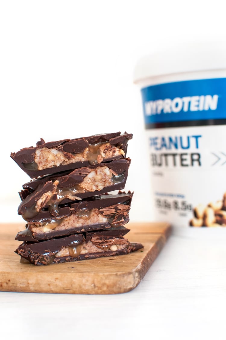 72g Myprotein arašidového masla 150g kvalitnej tmavej čokolády (alebo Myprotein proteínovej čokolády- 100g/27g bielkovín) - 55g hnedého cukru