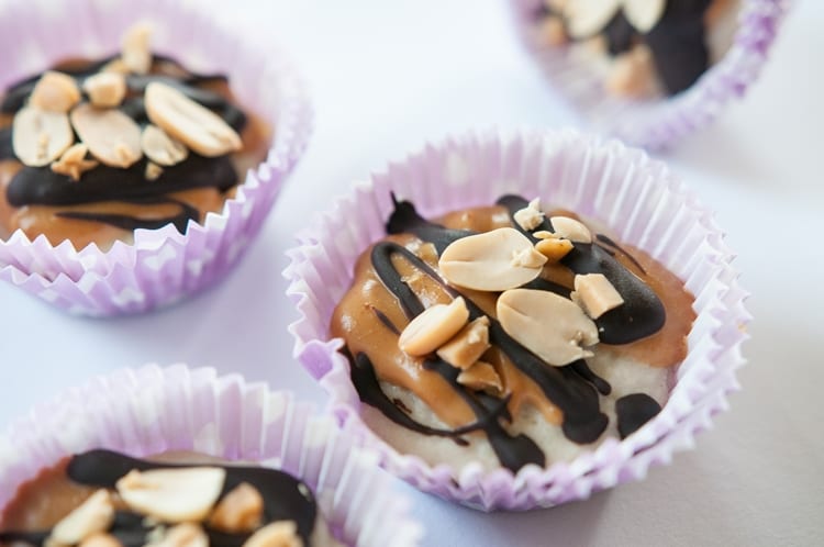 Nakoniec si vo vodnom kúpeli roztopíme čokoládu, ktorá pôjde na vrch. Čokoládu ešte posypeme arašidmi a odložíme stuhnúť do chladničky. Kešu krém úplne nestuhne, takže som časť vložila aj do mrazničky a tie boli konzistenciou ešte lepšie. Dobrú chuť!
